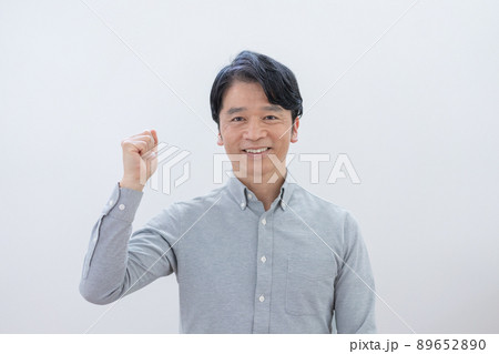 白バックのガッツポーズのミドルエイジの男性