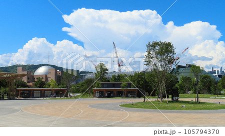 ひろしまゲートパークから望むこども文化科学館、建設中の広島サッカースタジアム、広島グリーンアリーナ