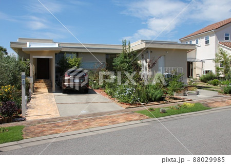 青空に映えるコの字型で平屋建てで落ち着いた雰囲気のアースカラーのスタイリッシュな美しい邸宅