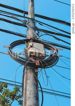 Large coils of wires and cables on a pole, the chaos of Asian power lines.
