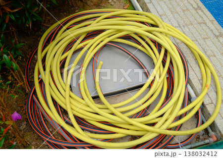 Coiled yellow garden hose on ground closeup