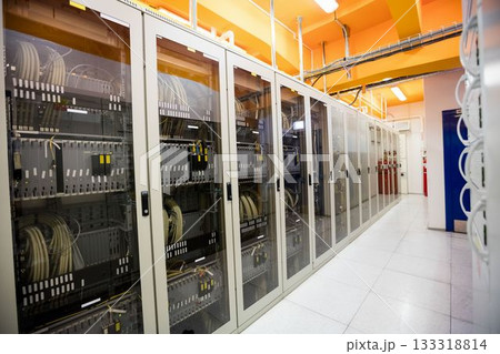 Flat design cabinets are lining data center corridor, showing patch cables, trays, tiles, lights
