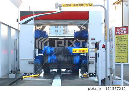【HDR風】稼働中の洗車機を自動車の運転席から見た様子