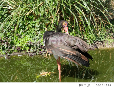 Stork cleaning its feather thoroughly near big lake during hunting on frogs, snakes and mosquitoes