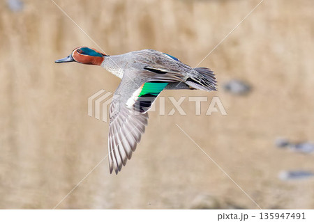 飛翔するコガモの雌