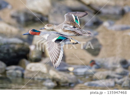 つがいで飛ぶコガモ