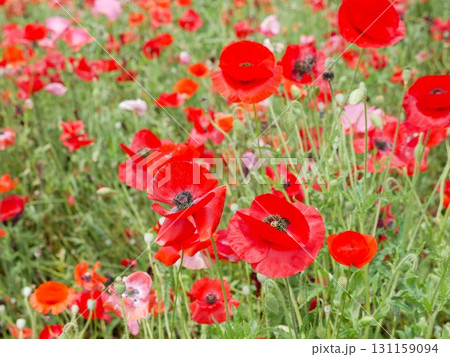 初夏に咲く赤いポピーと色とりどりの花の写真