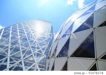新宿高層ビル街 快晴 青空 緑 コクーンタワー前 降り注ぐ太陽