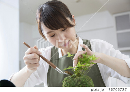 コケ玉作りを楽しむ日本人の若い女性、ガーデニング、趣味