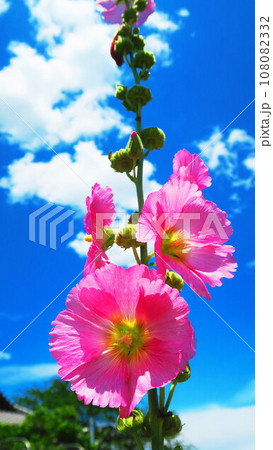 夏の青空とタチアオイの風景