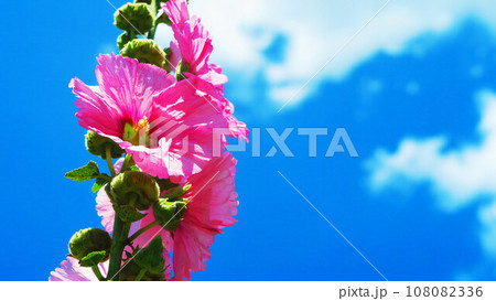 満開のピンク色のタチアオイと青空の風景