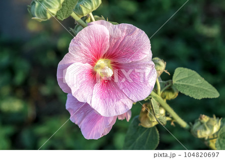 夕陽を浴びて花びらが映える桃色タチアオイ