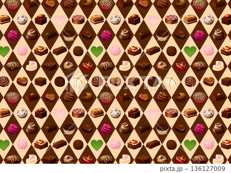 ダイヤチェックと様々なボンボンショコラの背景ベージュ