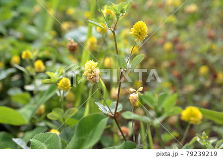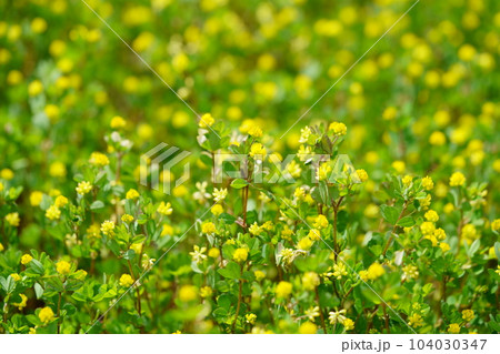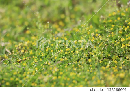 春の日本の野原に咲く黄色いコメツブツメクサの花