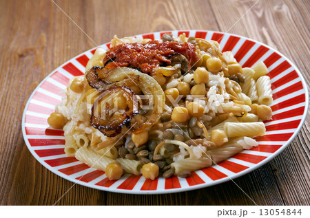 Egyptian Kushari with rice, macaroni, lentils, and tomato sauce