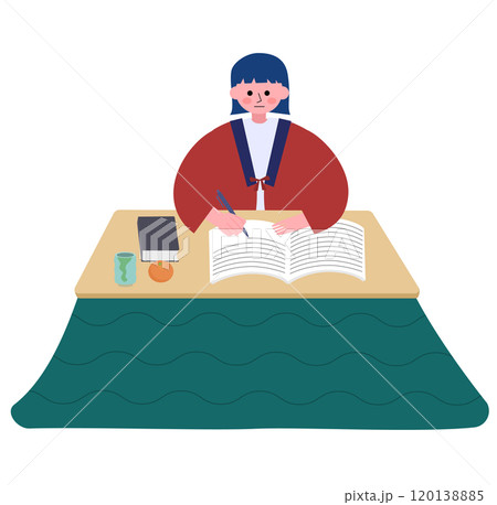 こたつに入って半纏を着て勉強する若い女性のイラスト