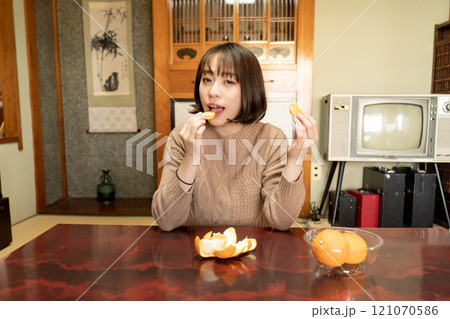 こたつでミカンを食べる2人