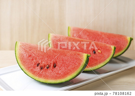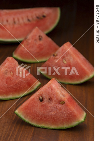 「三角形にカットした赤色の小玉スイカ」