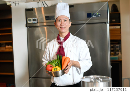 沢山の野菜を持つ若いアジア人の男性調理師