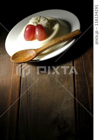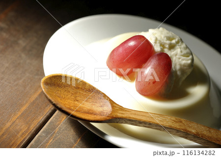 クリームと葡萄を乗せたパンナコッタを俯瞰で撮影