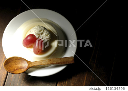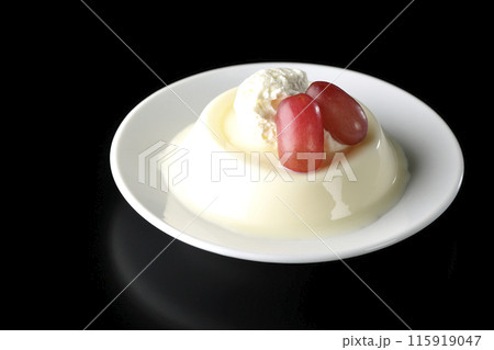 クリームと葡萄を乗せたパンナコッタを黒背景で撮影