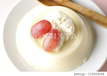 クリームと葡萄を乗せたパンナコッタを白背景で撮影