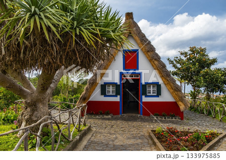 Traditional hut houses and garden of Madeira in village Santana. Sunny day in Portugal, tourist destination