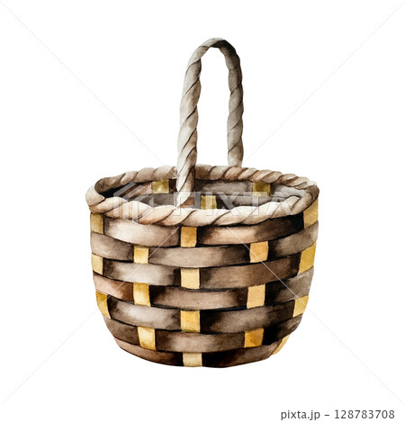 Wicker basket in soft brown tones, watercolor hand drawn isolated illustration. Rustic farmhouse style perfect for harvest, storage, or kitchen decor themes. Vintage container ideal for cottage, boho