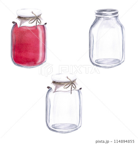 Set of glass jars in watercolor illustration on a white background. Hand drawn illustration of jars with lid for cookbooks, dessert recipes and rustic natural products, medicines.