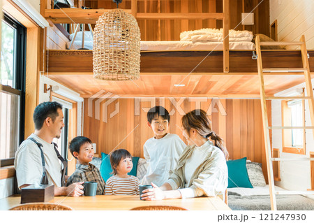 コテージ,キャビン,ログハウスでコーヒーを飲みながコテージ,キャビン,ログハウスら笑顔で会話する夫婦