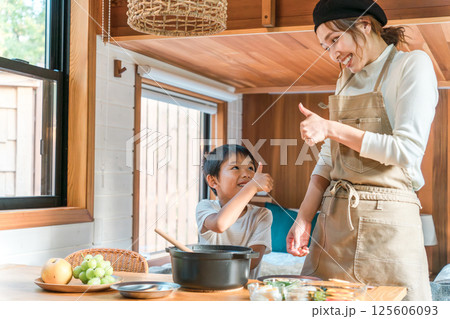 バンガロー・コテージ泊で食事の支度を親子で楽しむファミリー(家族旅行・グランピング)
