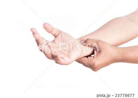 Close up woman's hand holding her wrist isolated on white . Elbow pain concept.