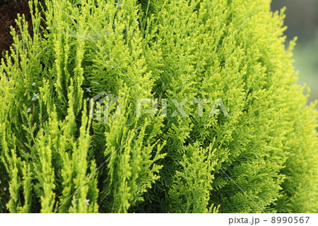 樹形が卵形の針葉樹(コノテガシワ)の外周部に密集する葉に焦点を定めて撮影した写真
