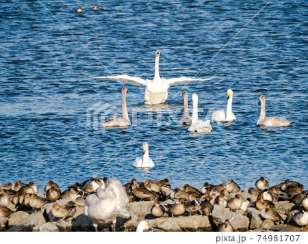 北浦の美しい白鳥たち 家族と鴨の群れ