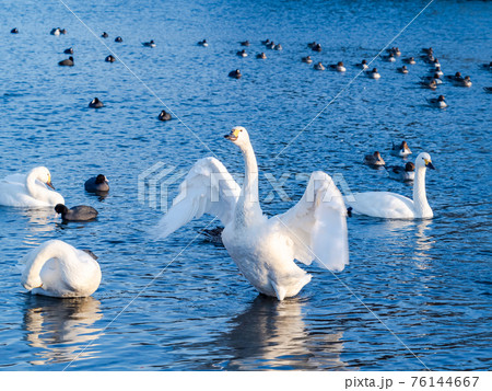 北浦の美しい白鳥たち 群れ 羽ばたき