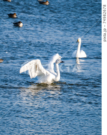 優雅で美しいコハクチョウの羽ばたき 越辺川に飛来した群