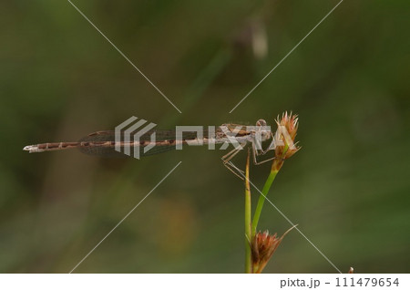 Closeup on the Small emerald spreadwing , Lestes virens perched in the vegetation