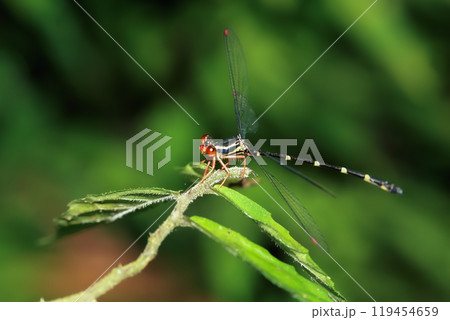Red-legged Flatwing Damselfly Perched on a Leaf.