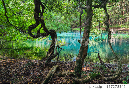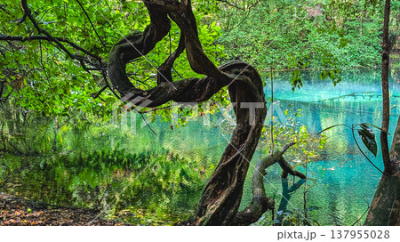 鮮やかな青い池 湧水の丸池様とうねった木