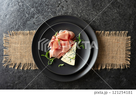 Italian prosciutto crudo with olives and rosemary on a black stone table.