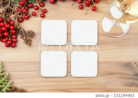 Flat lay mockup of four blank square coasters on rustic wooden table with wineglass and berries, top view product scene in natural studio lighting, ideal for branding and sublimation design