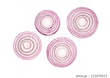Raw onion rings isolated on white background. top view