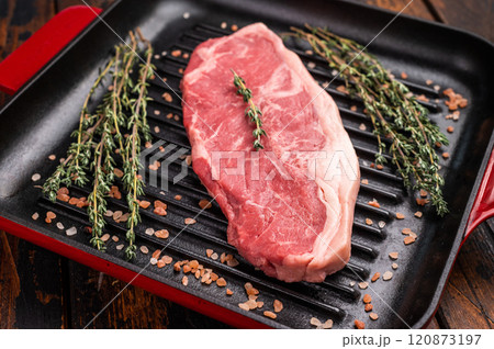Fresh strip loin beef steak, striploin steak on a grill pan wooden background. top view
