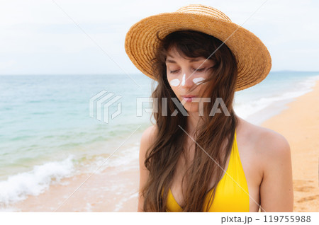 Portrait of beautiful smiling woman applying sunscreen on face and looking thoughtfully away standing on beach in straw hat and yellow bikini