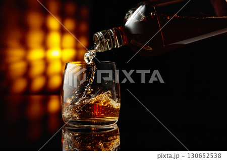 Pouring whiskey from a bottle into a glass.
