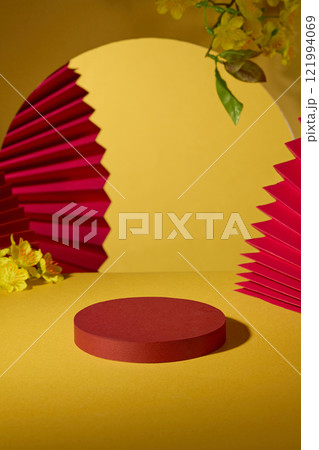 Overhead view of an empty red cylindrical podium for presentation products in a center, decorated with red paper fans and yellow apricot blossoms. Against a yellow background. Lunar New Year theme.