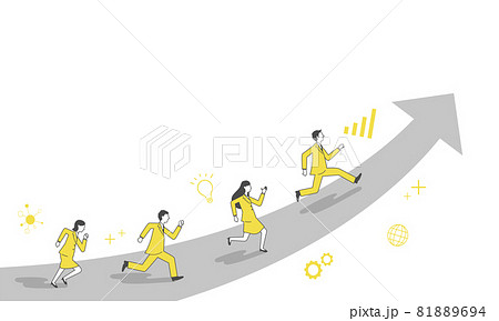伸びる矢印と駆け上がるビジネスパーソン、白バック、コピースペース、ベクター