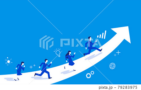 伸びる矢印と駆け上がるビジネスパーソン、青バック、コピースペース、ベクター
