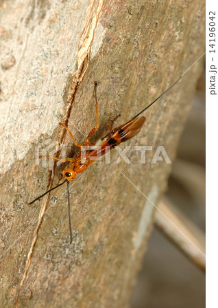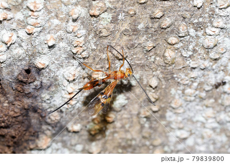 生き物 昆虫 ヒメウマノオバチ、メスには体と同じくらいの長さの産卵管があります。カミキリムシの幼虫に産卵します