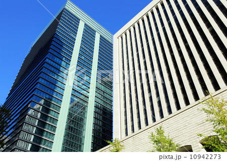 A modern blue skyscraper peeking out from behind a classic building. The contrast between old and new is emphasized by the clear blue sky with white clouds.